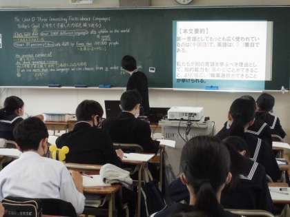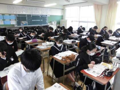 英語科と社会科の授業の様子です。先生の話を聞き、ノートにまとめています。真剣に授業に取り組んでいます。