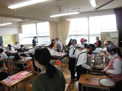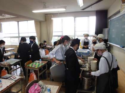 4月17日(日) 給食当番【1年生】 公開日 2022/04/17 更新日 2022/04/17 1年 先週、楽しみにしていた給食が始まりました。給食当番になった生徒たちは、感染症対策を心掛けながら、責任をもってそれぞれの役割をこなしています。先週はハンバーグやラーメンなど、人気メニューが目白押しでした。今週もたのしみですね!