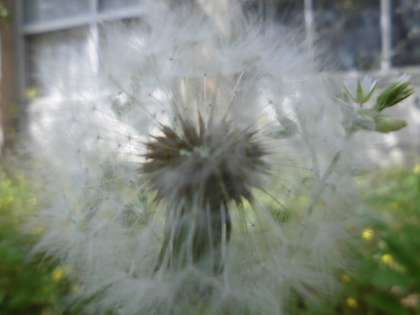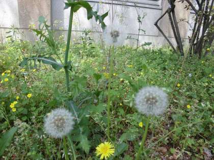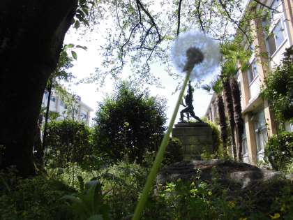 昨日に続き、「葉栗中の風景クイズ」です。タンポポの綿毛が風に揺れています。綿毛はまん丸の頭を右に左に揺らします。おやおや、力強そうな人が、タンポポが倒れないように支えていますね。