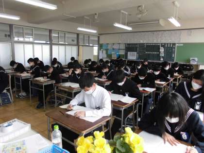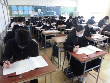 全国学力・学習状況調査(国・数・理)を受けました。全国の小学6年生と中学3年生を対象としたもので、児童生徒の学力や学習状況を把握・分析し、教育施策の成果と課題を検証し、その改善を図ったり、学校における生徒への指導の充実や学習状況の改善等に役立てたりします。普段のテストとは違った、文章をよく読んで答える問題に、生徒たちは苦戦しつつも最後まで一生懸命取り組んでいました。