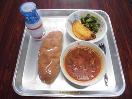 ポークビーンズは、アメリカの家庭料理で、豚肉と豆をトマトなどで煮込んで作ります。アメリカでは白いんげん豆がよく使われますが、給食では、大豆を使っています。今日は、豚肉と大豆の他に、にんじん、たまねぎ、じゃがいも、マッシュルーム、トマトなどたくさんの食材を使っています。