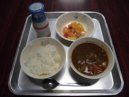 ご飯、牛乳、ポークカレー、フルーツカクテル