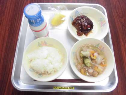 ご飯、牛乳、コンソメスープ、ハンバーグのいろどりソースがけ、冷凍カットパイン