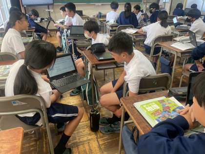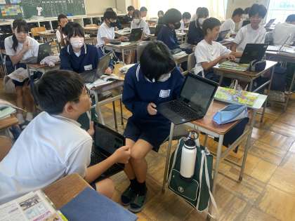 1年生社会の授業では、現在地理の学習をしています。世界各地の人々の暮らしを、自然環境と関連付けながら理解を深める内容です。これまでの3時間の授業でまとめたスライドをもとにペアで発表を行いました。