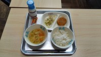 今日の献立は、豚キムチいため、揚げぎょうざ、チンゲンサイと豆腐のスープ、牛乳、ご...