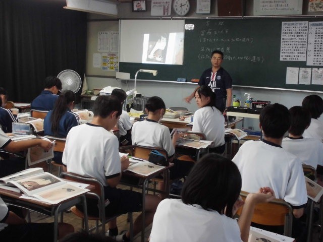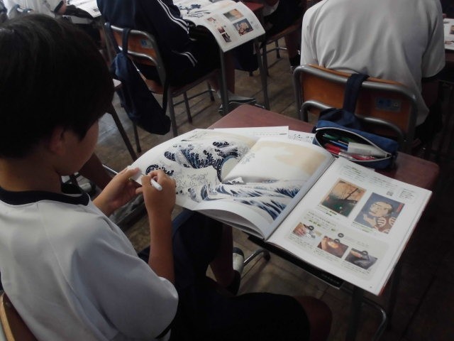 10月7日(火) 2年生 浮世絵っておもしろい 公開日 2025/10/07 更新日 2025/10/07 2年生 美術の授業で、浮世絵について学んでいます。今日は、代表的な浮世絵を見ながら、大胆な構図や誇張した表現などの魅力を味わいました。