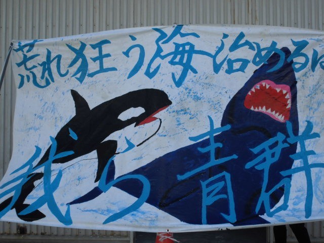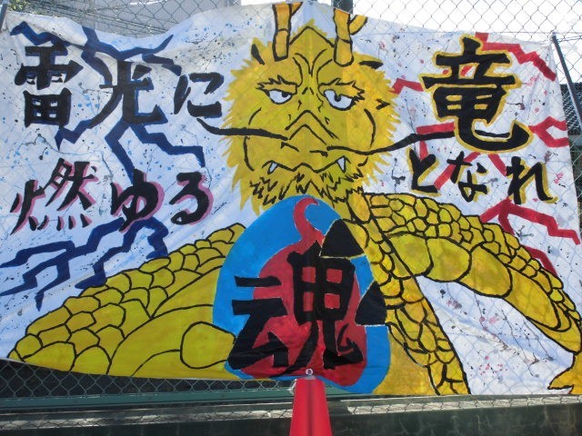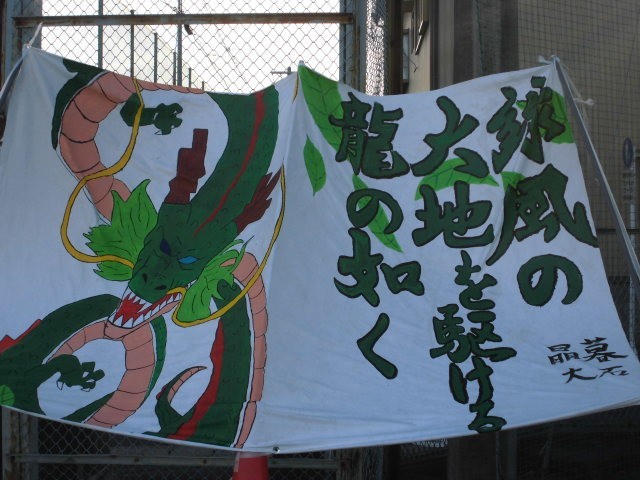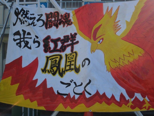 群団旗は3年生のみなさんが一生懸命作ってくれました。これらのスローガンのもと、心を合わせて精一杯に演技や競技をしてほしいと思います。