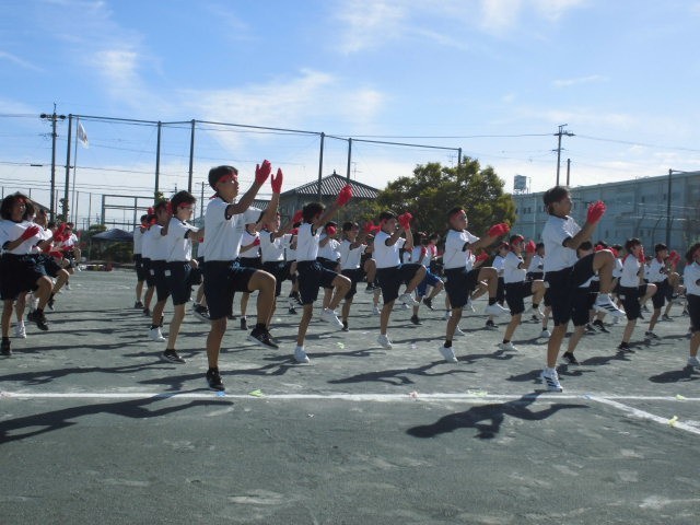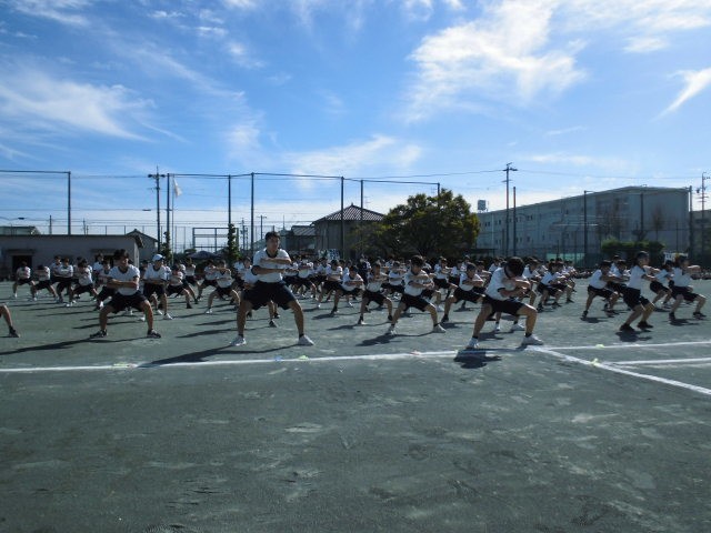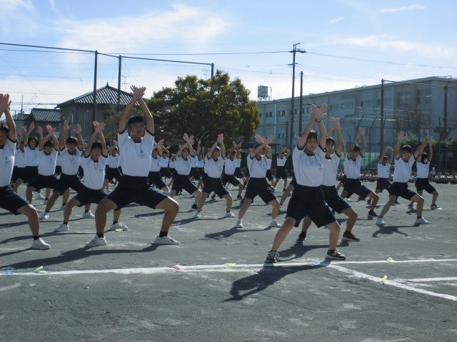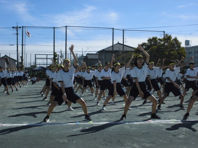 群団ごとに応援のパフォーマンスを披露します。3年生が夏休みから構想を練り、後輩に教え、学年の枠を超えて創り上げました。