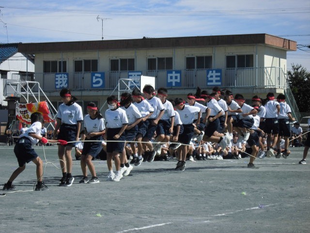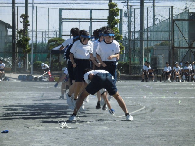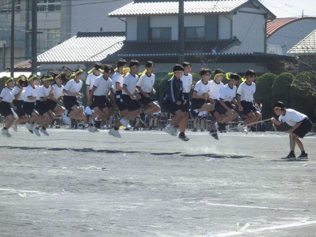 学級対抗の「大縄跳び」です。全員が息を合わせて跳びます。何回跳べたかな。