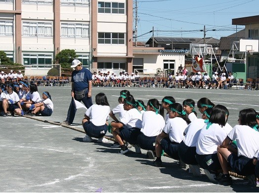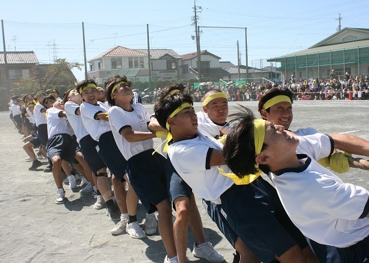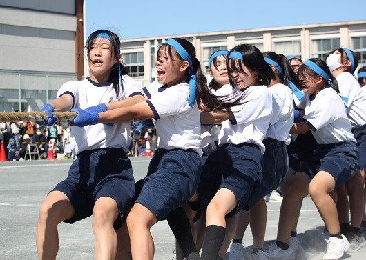 群団対抗種目の綱引きです。全学年で一緒に戦います。力と力のぶつかりあいの真剣勝負で、見ている側も、知らぬ間に手に力が入ってしまいます。