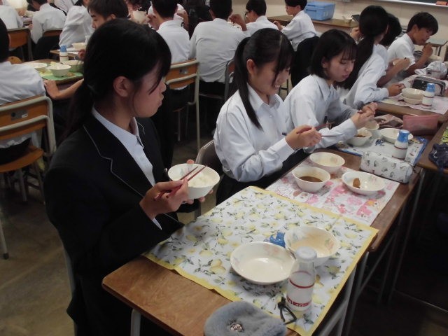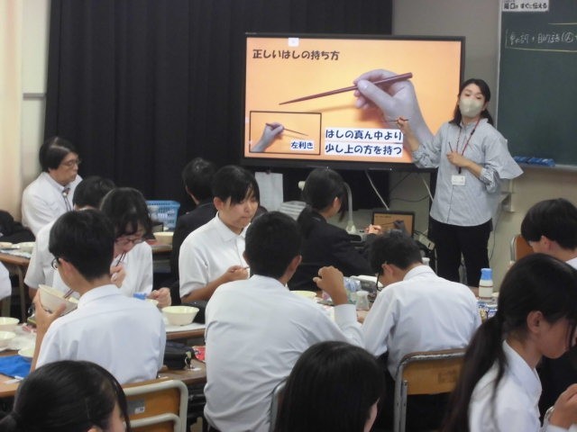 栄養教諭の先生が、給食の時間に教室で食育指導をしています。今日は2年生の教室で「正しい箸使い」について説明しました。