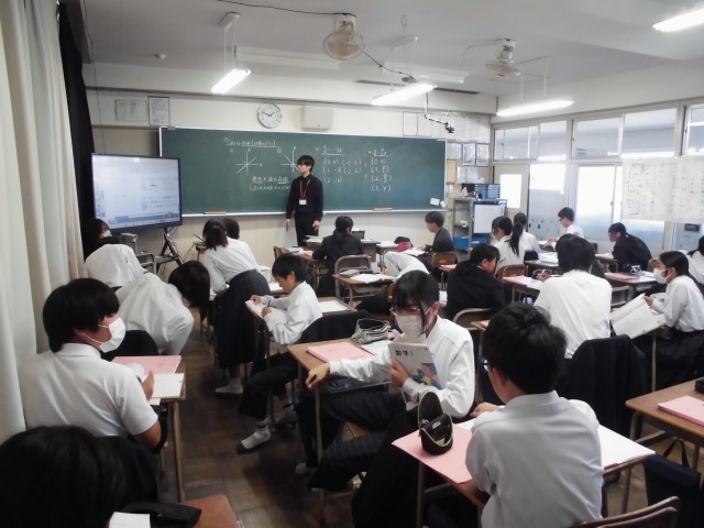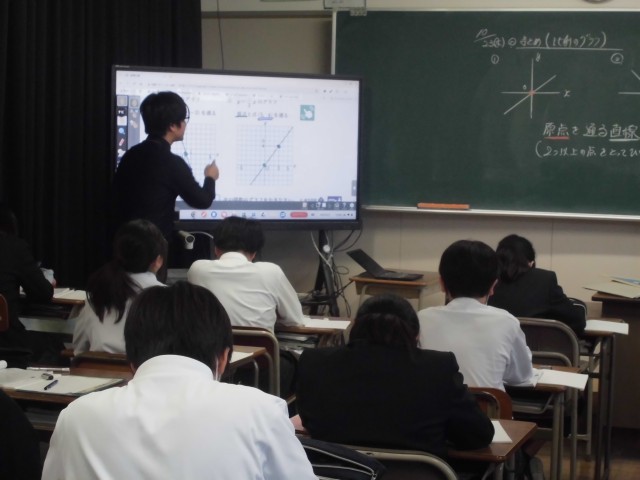 1年生の数学科の授業では、比例のグラフの復習を行いました。これまでの学習をもとに、根拠を明確にして自分の言葉で答えを周囲と確認しました。少し迷うところもありましたが、友だちの考えを聞いて知識を確実なものとしました。