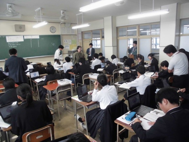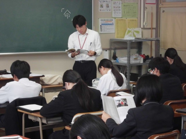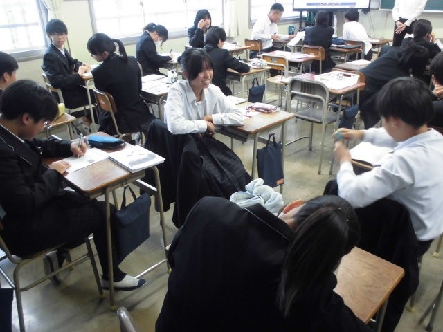 今日は教育実習生が道徳の研究授業を行いました。紛争という極限状況における医師の判断についての議論を通して、命を大切にするとはどういうことかを考えるという授業です。生徒は、自分の気持ちを心の数直線で表現したり、グループになって意見を交換したりする中で、多くの価値観に触れることができました。