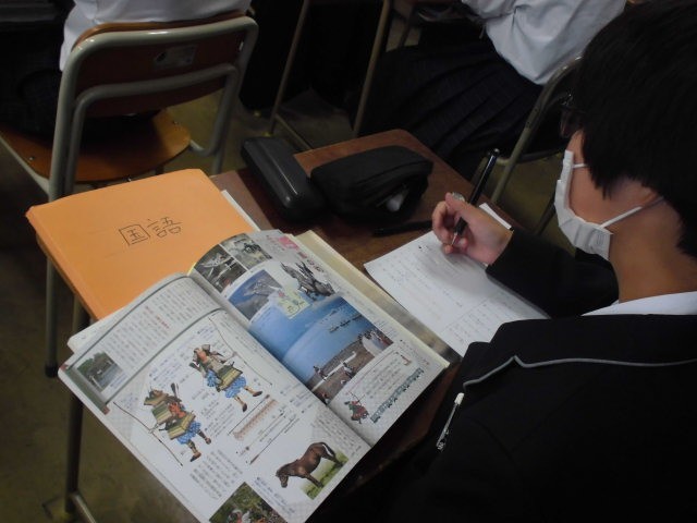 国語の授業で「平家物語」を読んでいます。今日は「扇の的」の与一や義経の言動、扇の的を射落とした後の人々の反応に着目して、古人のものの見方や考え方を捉えました。