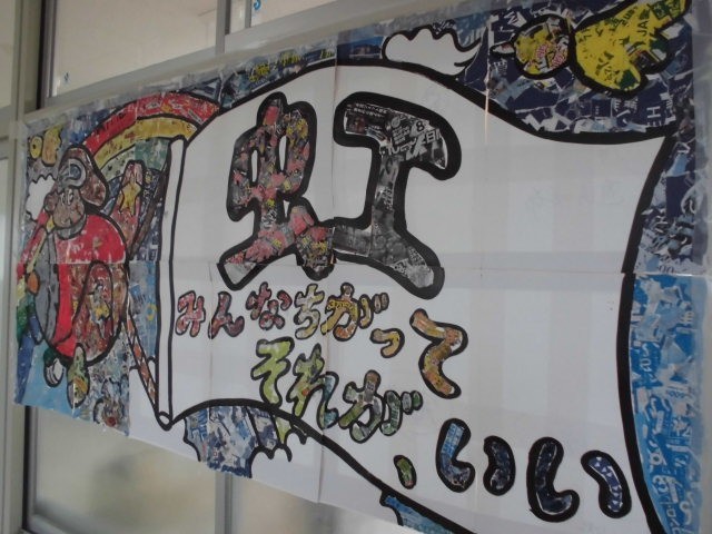 10月31日(金) 6・7・8組 みんなで作った宝物 公開日 2025/10/31 更新日 2025/10/31 6・7・8組 教室前の廊下に美術の授業で作った共同制作作品が展示してあります。新聞に入っている広告を色ごとに分け、細かくちぎったものを貼り付けて絵にしたものです。すばらしい作品になりました。みんなで協力して作った宝物です。