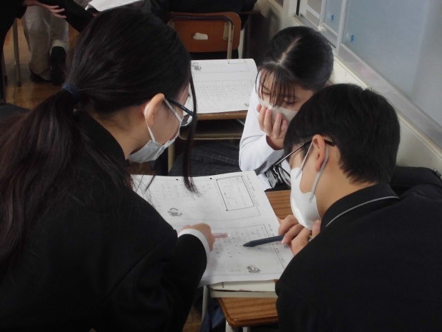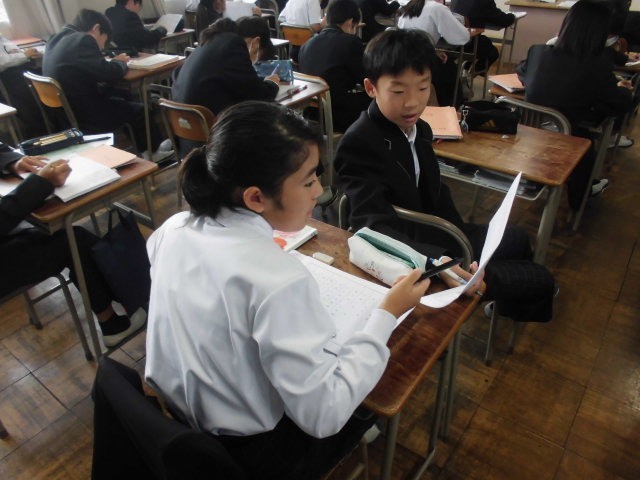 国語の授業で漢文を勉強しています。今日は書き下し文を参考にして、読む順序を示す訓点をつけていきました。なかなか難しく、自分の考えに自信が持てません。友だちと確認したり、教え合ったりしながら進めました。