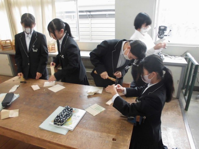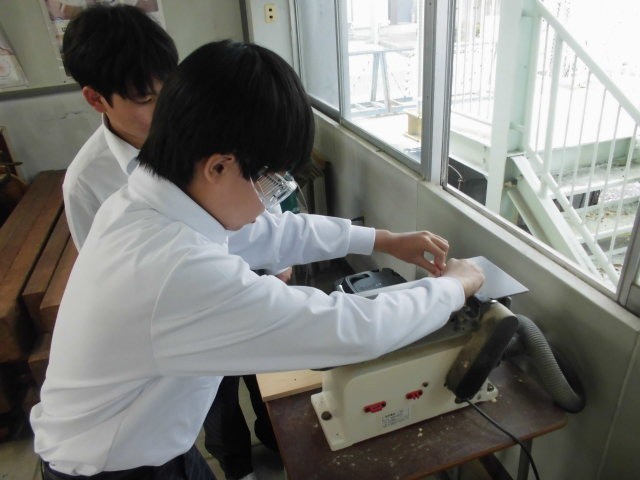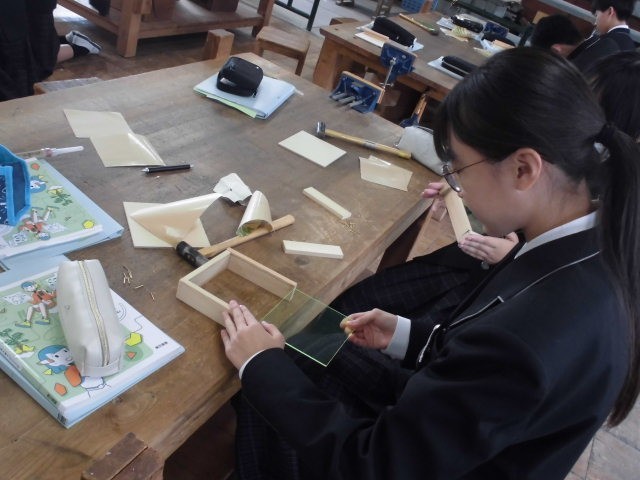 技術の木工の授業で、木箱を製作しています。今日は、部品の切削、穴あけ、釘での接合を行いました。アクリル板のふたを溝に通して開閉できるように、部品の位置を合わせ、細かな調整をしながら組み立てました。