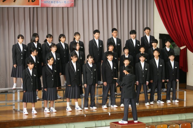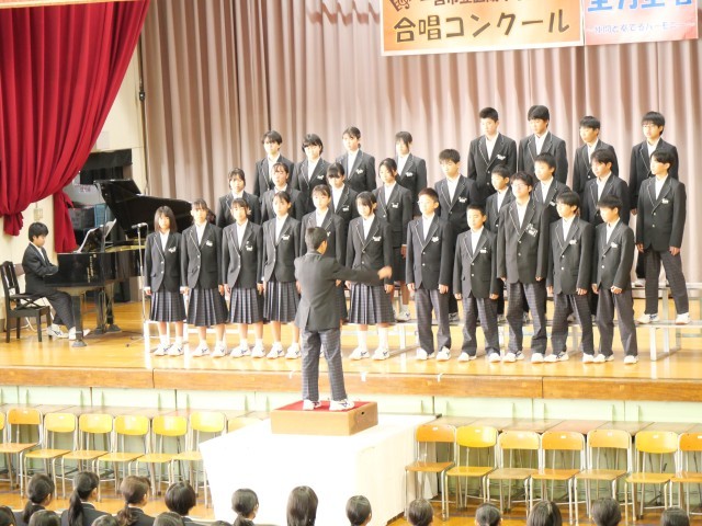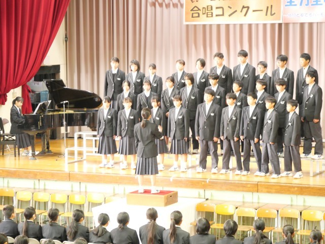 まずは1年学年合唱。他学年や保護者の前で披露した学年合唱は、1年生とは思えないほど堂々とした姿で、感動を覚えました。その後の各クラスの合唱では、これまでの練習の成果を十分に発揮し、こちらも周りに感動を与える合唱にすることができました。