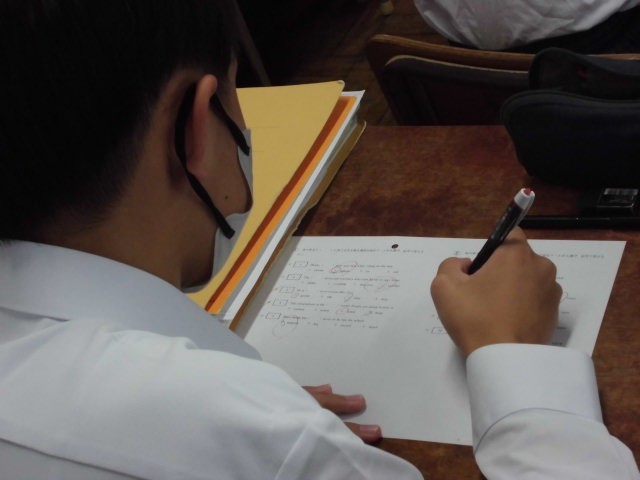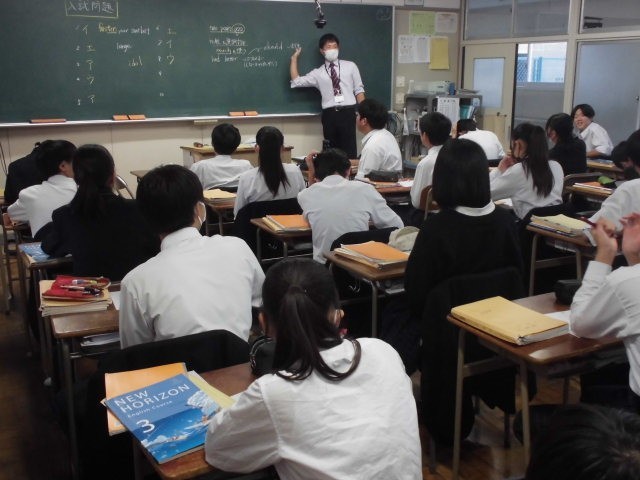 英語の授業で過去の入試問題に挑戦しました。どのような形で出題されるのかを知り、慣れておくと、本番で実力を十分に発揮できますね。練習あるのみ!
