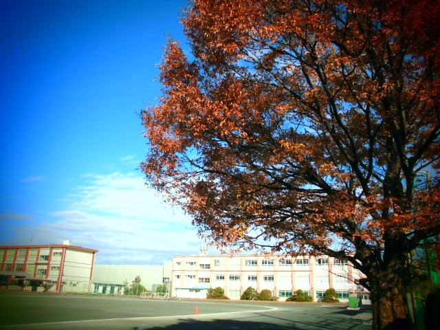 校庭のケヤキの葉が染まり、季節を感じさせます。ケヤキは根が強く広がり、大木に育つのもはやく、四季折々で美しい姿を見せてくれます。また、木材としても木目が美しいのに加えて、摩耗に強く耐久性のある材料として重宝されています。