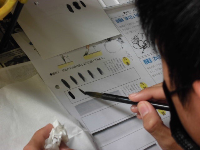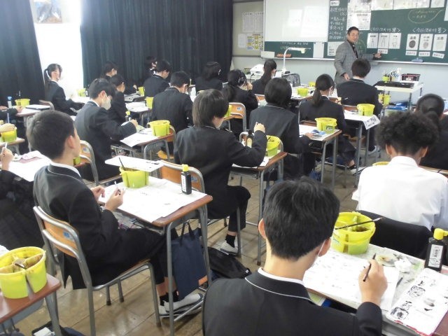 美術の授業で水墨画を描きます。今日は基本の調墨について練習しました。水の量によって濃さを調整した墨で濃淡を表現します。筆に含ませる量にも関係するため難しいです。自分の思うような濃淡をうまく表現できましたか。