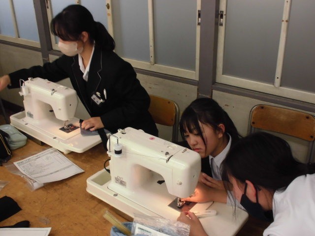 家庭科の授業で、トートバッグを作っています。今日はバッグの持ち手の部分をミシンで縫いました。普段あまり使わないミシンですが、上手に縫えましたか。どんなトートバッグができあがるか楽しみですね。