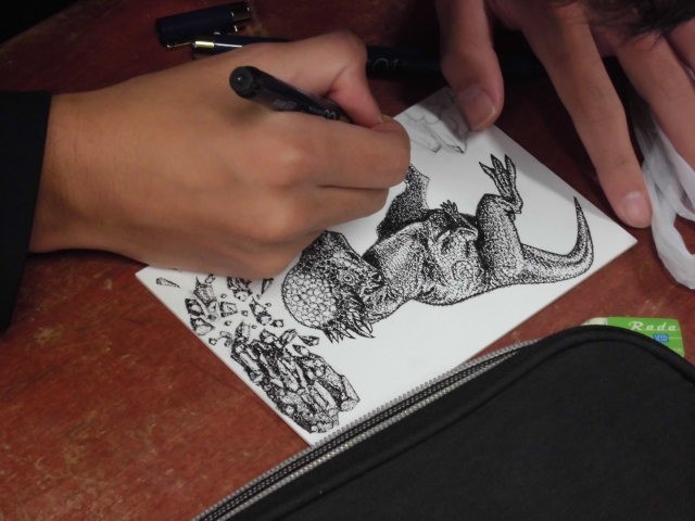 美術の授業で「点描」に挑戦しています。どうやって表現したらよいかを考え、先生からアドバイスをもらいながら、細かく難しい作業にも一生懸命に取り組んでいます。その姿や表情から、楽しんで制作していることが分かります。すばらしい。