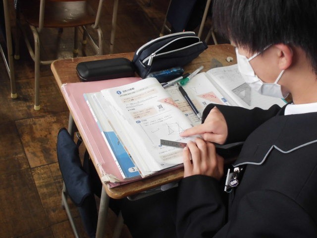 数学の授業で「平面図形」について学んでいます。今日は図形の移動の意味とその性質について、図形の各点の移動を指で追いながら、その性質について確認しました。移動前後の2つの図形の関係に着目して、どのような移動をしたのかについて考えました。