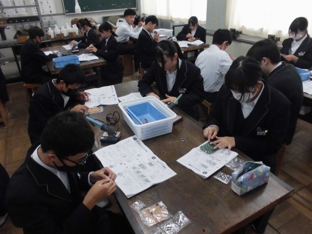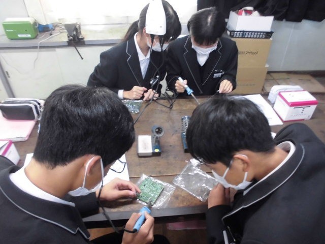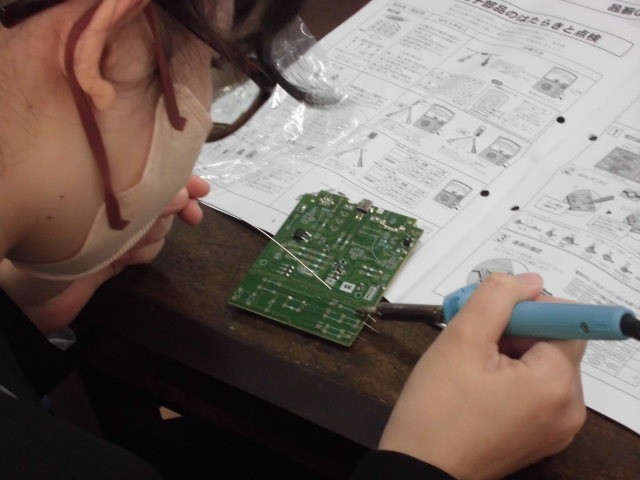 技術の「電気回路の製作」でラジオを作っています。今日は、基板に電子部品をはんだづけしました。先生から教えてもらったはんだづけのこつを生かして、はんだごてを使って部品を取り付けました。