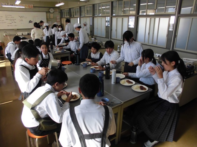 1年生の家庭科の授業では、調理実習を行いました。安全かつ時間内に実習に取り組むことを目標に、豚の生姜焼き、スノーマッシュポテト、ゆでブロッコリー、人参とコーンのコンソメスープの4品を完成させました。