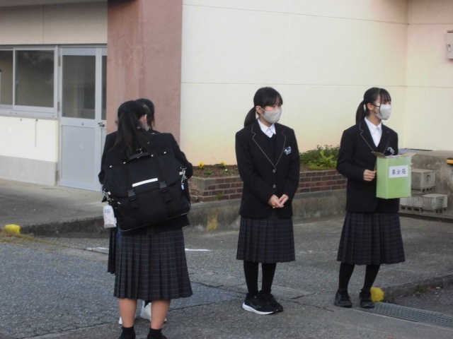 昨日から登校時に「赤い羽根共同募金」の呼びかけを行っています。今日も募金を呼びかける声が響きました。この募金で集まったお金は、私たちが暮らす地域の社会福祉を目的とする様々な事業に幅広く使われます。一人一人は小さな協力でも、集まると大きな成果となります。募金は明日まで行いますので、ご協力をお願いします。