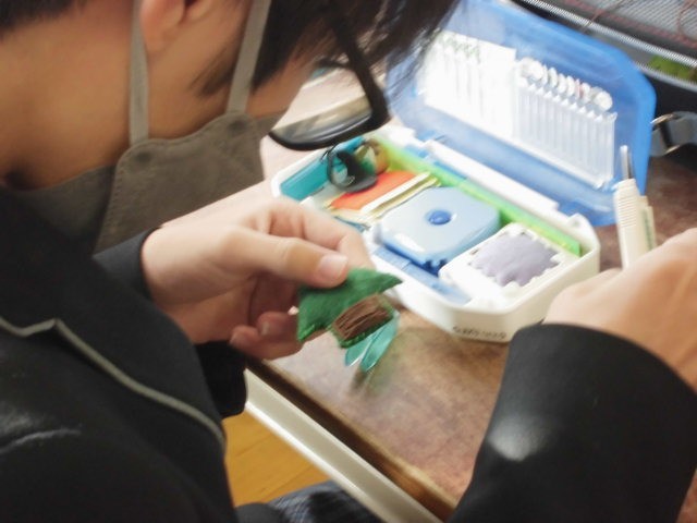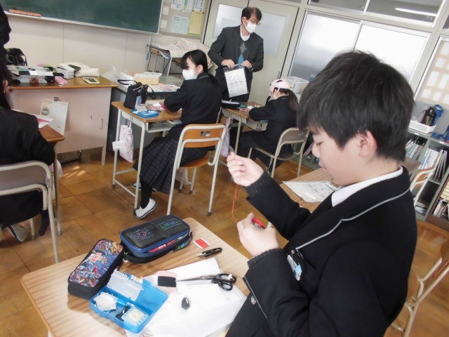 家庭科の授業でマスコットづくりに挑戦しています。好きな果物などをモチーフにしたマスコットを、フェルトの部品を縫い合わせてつくります。みんな夢中でつくっています。最後は、マスコットをキーホルダにしていきます。完成が待ち遠しいですね。
