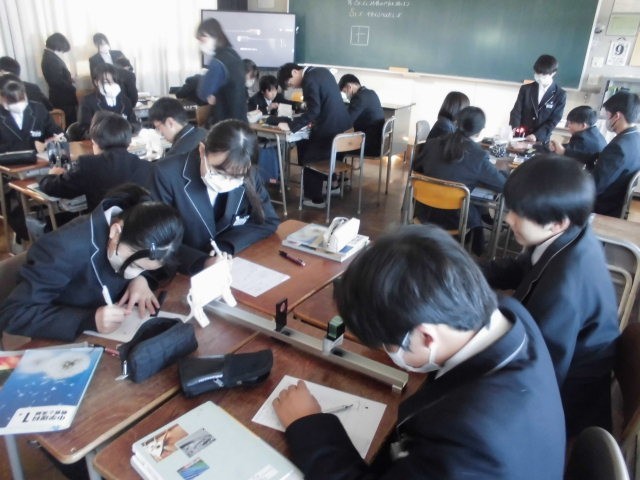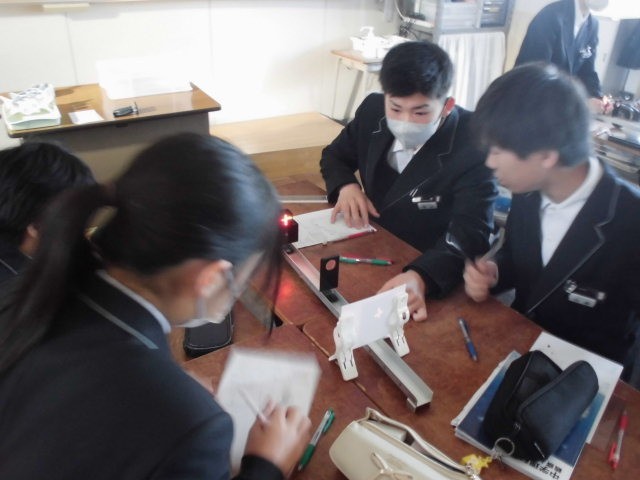 理科の授業で、光の性質について学んでいます。今日は、凸レンズと物体との距離によって、凸レンズによる像の見え方に違いがあるのかを、実験で確かめました。班員で協力して、物体やレンズ、スクリーンの距離や、像の見え方を一つずつ確認し、きまりを見つけました。
