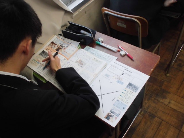 社会科の授業で「財政と国民の福祉」について学んでいます。今日は、日本の社会保障の四つの柱について、思考ツールを使いながらまとめ、それぞれの観点から、国が国民の生活を保障するということについて考えました。