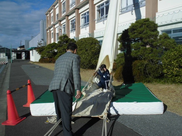 災害が起こり1年生の教室がある3階に取り残された場合を想定し、救助袋をつかった避難訓練を行いました。一度経験しておくと、万一の場合にも落ち着いて避難することができますね。