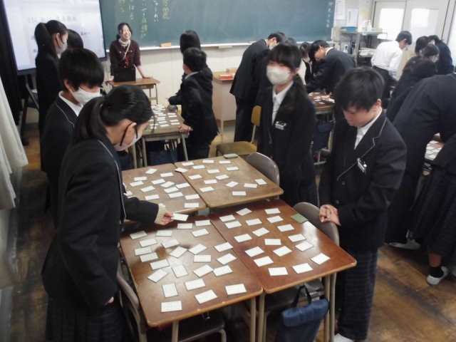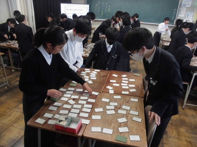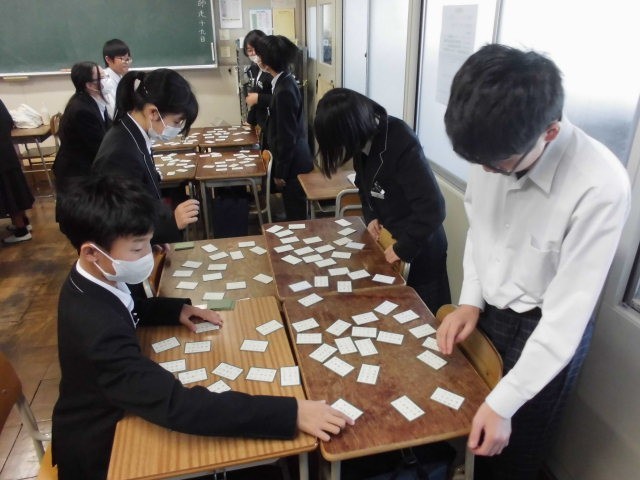 国語の授業で、百人一首かるたを行いました。楽しみながら、五・七・五・七・七のリズムと、古語の響きの美しさに触れることができました。