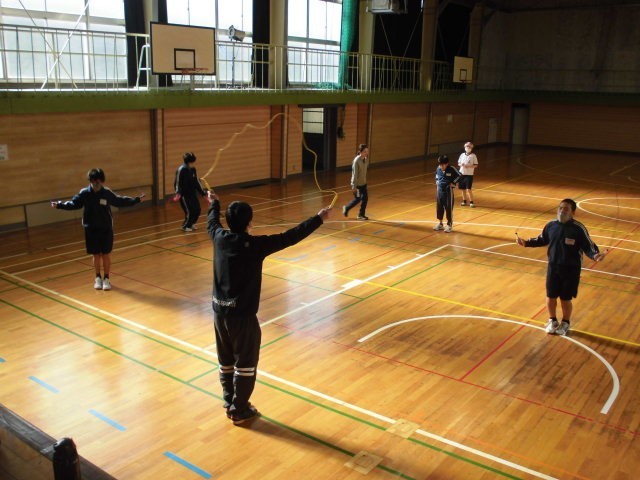 体育の授業で、縄跳びの練習をしています。いろいろな跳び方に挑戦し、以前よりもたくさん跳べるように頑張っています。