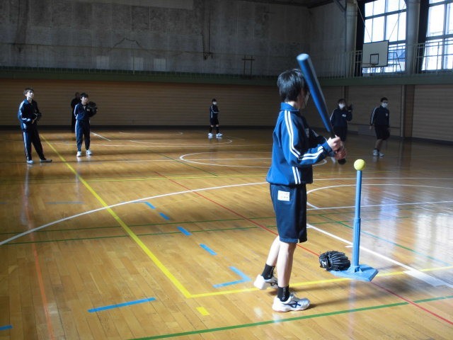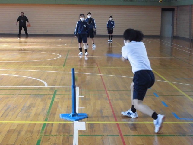 体育の授業でソフトボールを行います。今日は打撃と守備の練習として、ティーバッティングをしました。スタンドで支えられ、静止したボールでも、細いバットの中心に当てるのは難しいですね。
