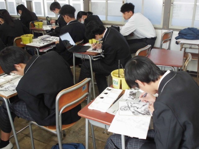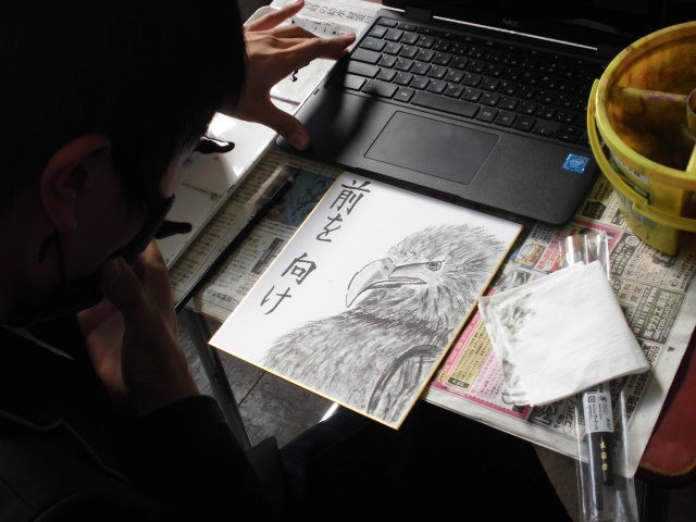 2月9日(月) 2年生 いよいよ完成 公開日 2026/02/09 更新日 2026/02/09 2年生 美術の授業で水墨画に挑戦しています。濃淡を使い分けて描き、文字を入れます。完成したみんなの作品を見るのが楽しみですね。