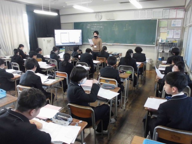 数学の授業で「データの活用」について学んでいます。今日は度数分布表やヒストグラムを使ってデータを比べ、それぞれの傾向や特徴を捉えました。二つの会社の給料額の比較から、それぞれの会社のよさを考えて話し合いました。