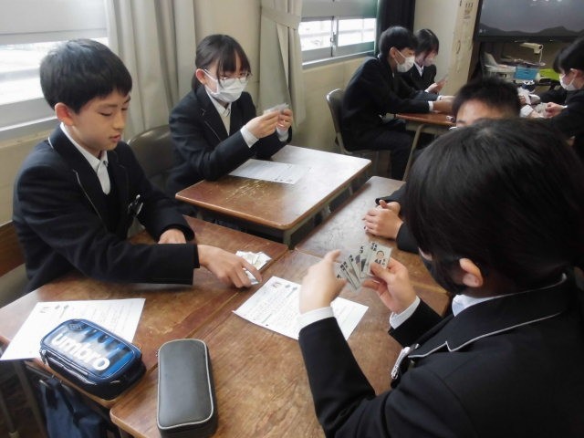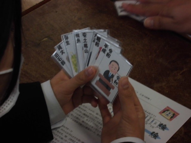 社会科の授業で、日本の歴史の時代が書かれた札を用いてカードゲームをしました。みんなで楽しみながら歴史の復習をしました。
