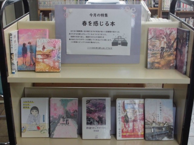 図書館の3月の特集は「春を感じる本」です。窓から差し込む日差しに春を感じるようになりました。みなさんの進級を春のあたたかさが後押ししてくれているようです。そんな季節にぴったりの本を集めました。 今年度の開館日も残りわずかとなりました。春休みに読む本も貸し出していますので、どんどん借りに来てください。