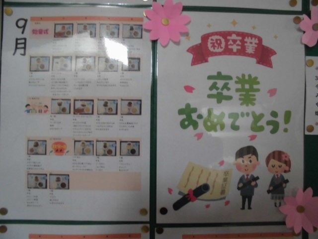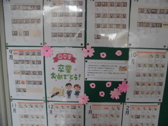 コンテナ室前に今年度の給食の献立と写真が掲示してあります。卒業までに3年生は、175食を食べるのだそうです。さらに義務教育の9年間では何食になるのでしょうか。給食のおかげでずいぶん大きくなりました。中学校で給食を食べられるのも、あと3回です。これまでお世話になった給食に感謝をしながら、クラスの仲間と、おいしく、楽しく食べてくださいね。