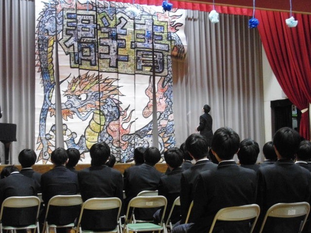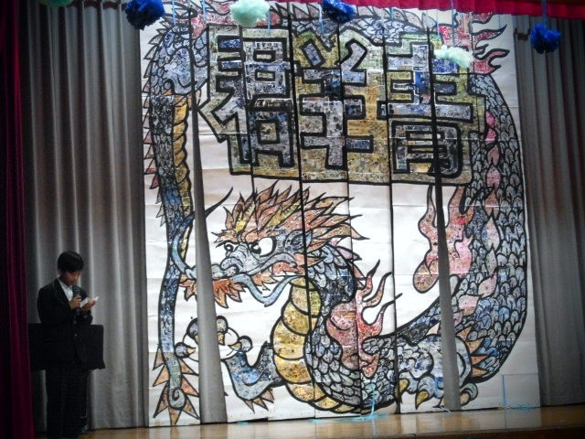 3年生の学年目標「群青」をイメージした巨大装飾です。全部で8枚の垂れ幕を一つずつ降ろしていき、最後に青龍が出現しました。3年生からの大きな歓声で、1年生のみなさんの頑張りが報われましたね。すばらしい!