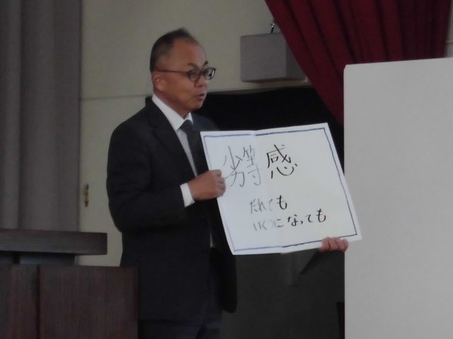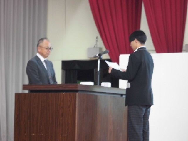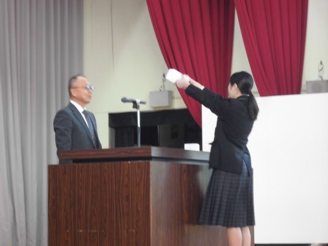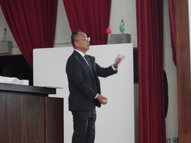 本日、3年生の同窓会入会式を行いました。代表生徒の「入会の誓い」、同窓会記念品の授与の後、同窓会長から「コインの裏表」というお話をいただきました。自分のダメな部分も見方を変えると長所になるということです。そして、最初は失敗するものだと思えば、不安が消えていろいろなことにチャレンジできるということを、ジャグリングの実演を交えて教えていただきました。