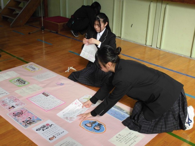 明日の卒業式に向けて、1・2年生が校内の掃除をして、会場をつくってくれました。一つ一つの椅子の位置を細かく調整し、厳かな雰囲気の中にも温かみがある会場ができあがりました。1・2年生のみなさん、ありがとう。