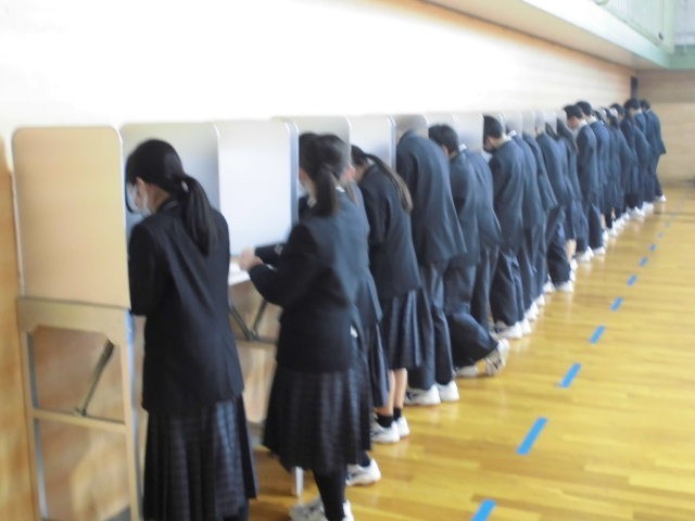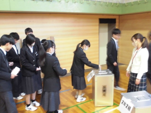 本日、来年度の前期生徒会役員選挙を行いました。実際に使われている投票箱と記載台を用いて投票を行いました。本当の選挙同様に、責任をもって一票を投じることができたのではないかと思います。 立候補した人たちは、全校生徒の意見を取り入れて、みんなが楽しく、気持ちよく過ごすことができる学校にしたいという思いを語ってくれました。来年度の生徒会活動も、さらに充実したものになりますね。