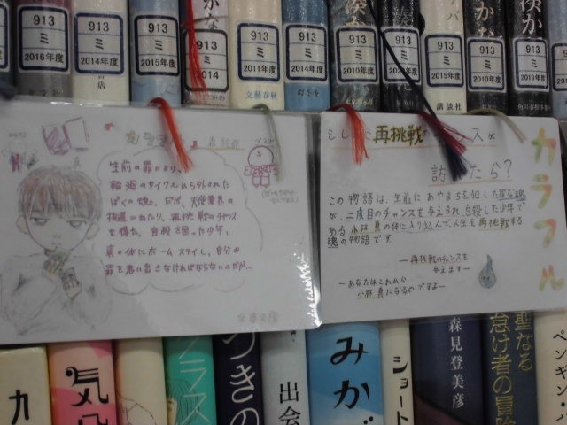 ポプラ社が開催している「全国学校図書館POPコンテスト」に1年生の生徒が応募して入賞しました。学校図書館にある本を紹介するPOPは、本の近くに掲示されています。そのPOPを見て、本を借りようと思う人が増えてくれたらうれしいですね。