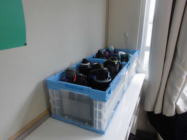 丁寧に整頓されたロッカーや水筒。先生がtの呼びかけ。