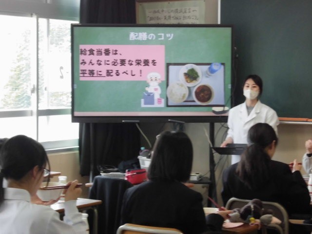 2年生では、栄養教諭により、給食の指導が行われていました。